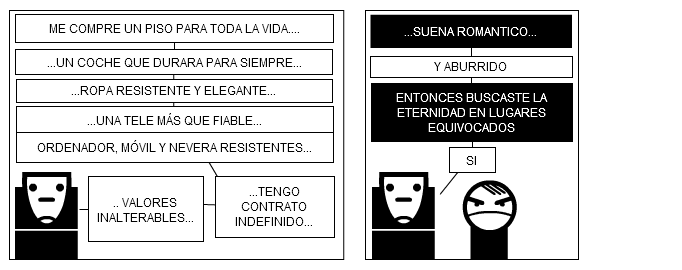 Pocas veces he sentido que una viñeta diga la verdad en tan pocas palabras, pero pienso que el capitalismo no triunfo por convencernos de lo que es necesario para ser feliz (un coche, uan moto..)nosotros mismos hemos buscados esos sucedaneos de felicidad mas faciles de encontrar y ahi sí nos lo han puesto facil.
